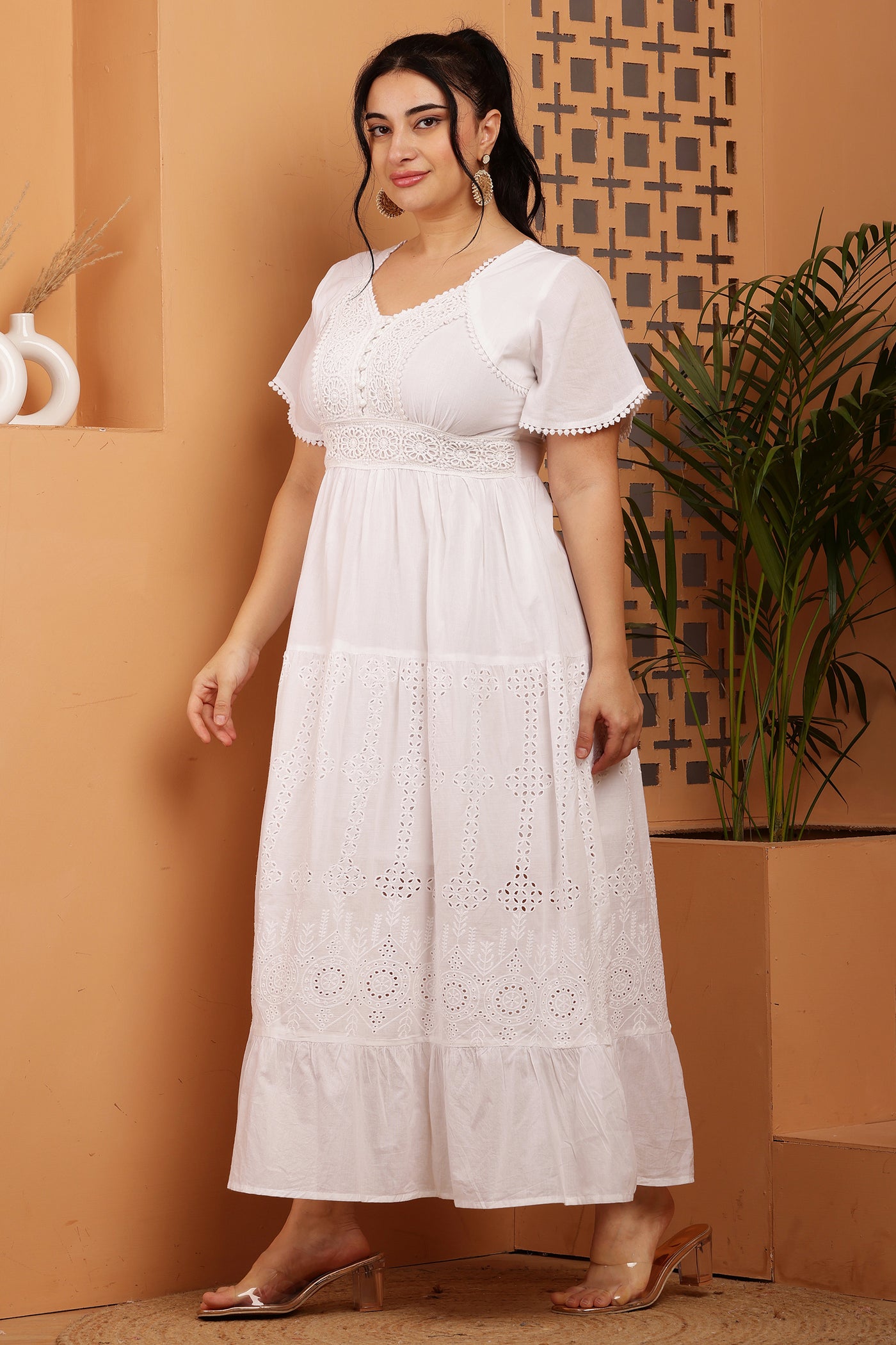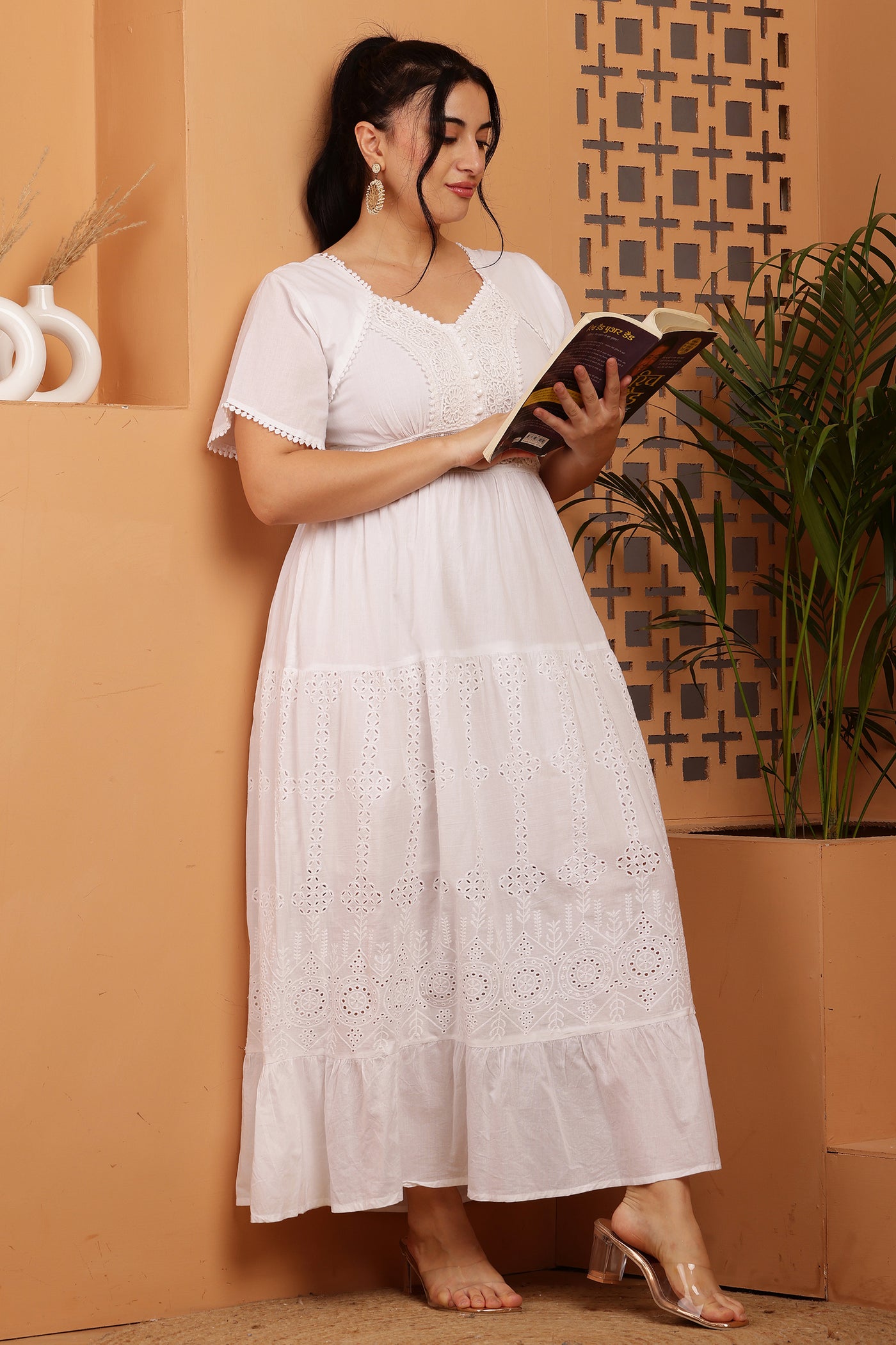 Sweetheart neckline, Half Sleeves, Floral Schiffli Design, Functional Loop- Buttons, Cotton Fabric & Lining